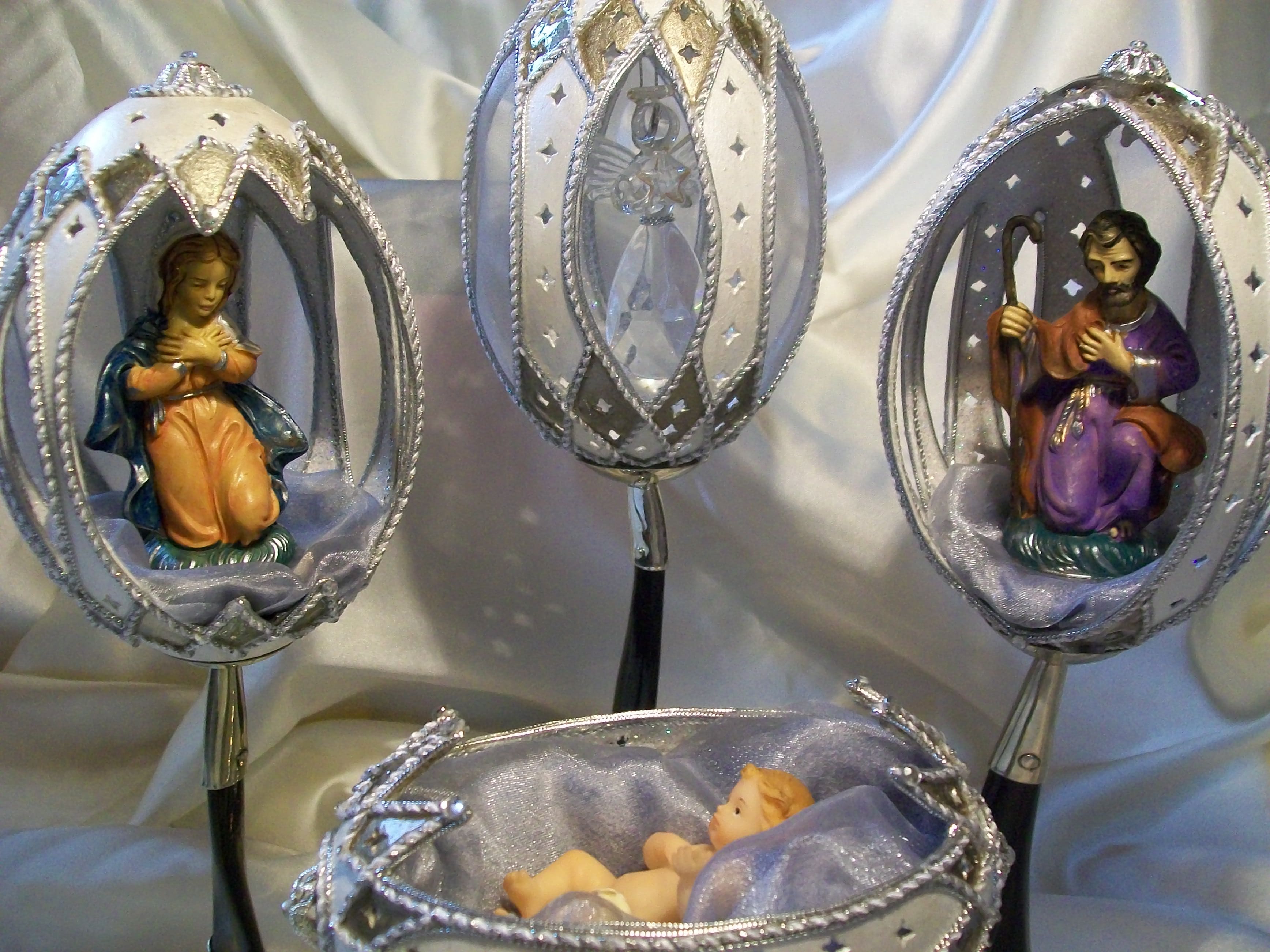 Premio a la CREATIVIDAD con el Pesebre "ARGENTO" realizado con cáscaras de huevos de ñandú, pies de alpaca y asta y figuras de resina en su interior. El ángel es una figura de vidrio.