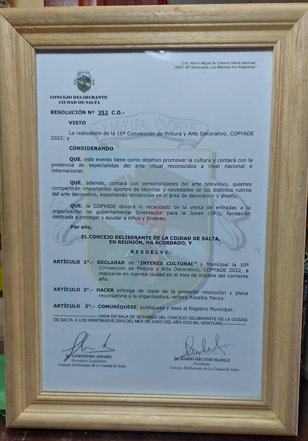Distinción por parte del Concejo Deliberante de la Ciudad de Salta, por los 10 (diez) años de la COPYADE
